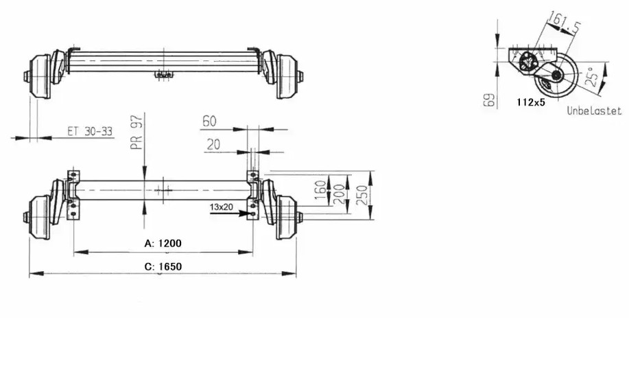 Trailer aksel 1350kg. A 1200, C 1650, 5 bolte